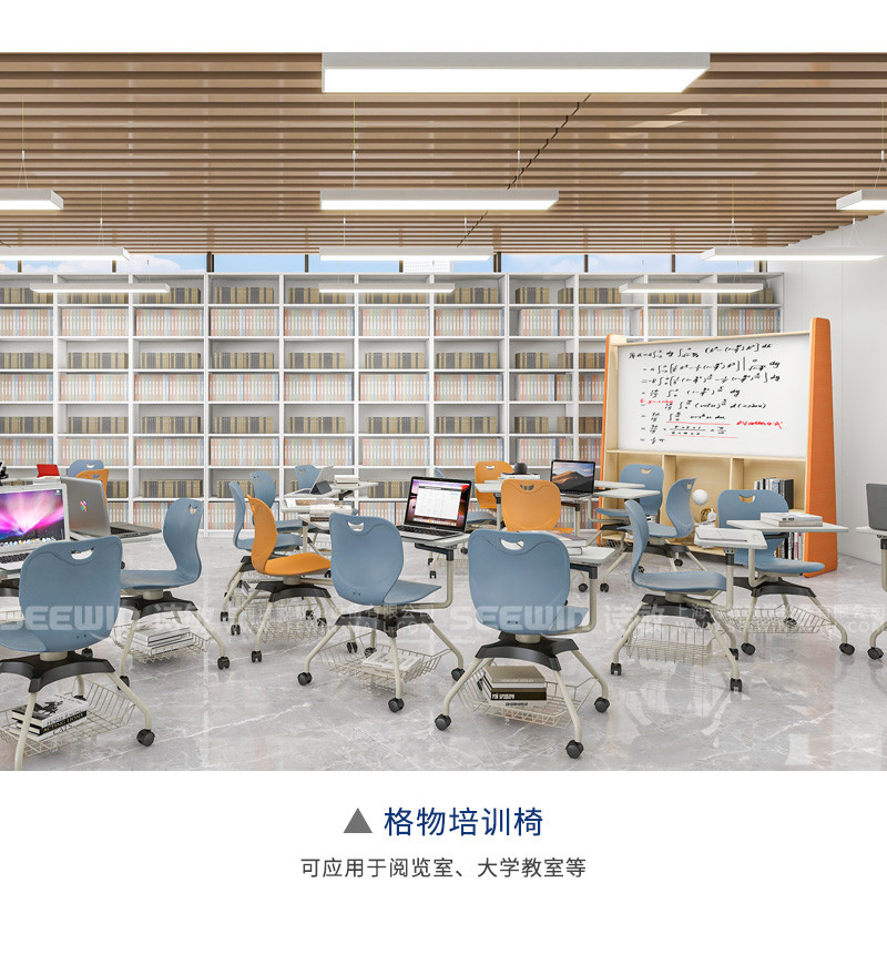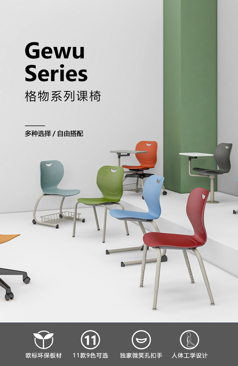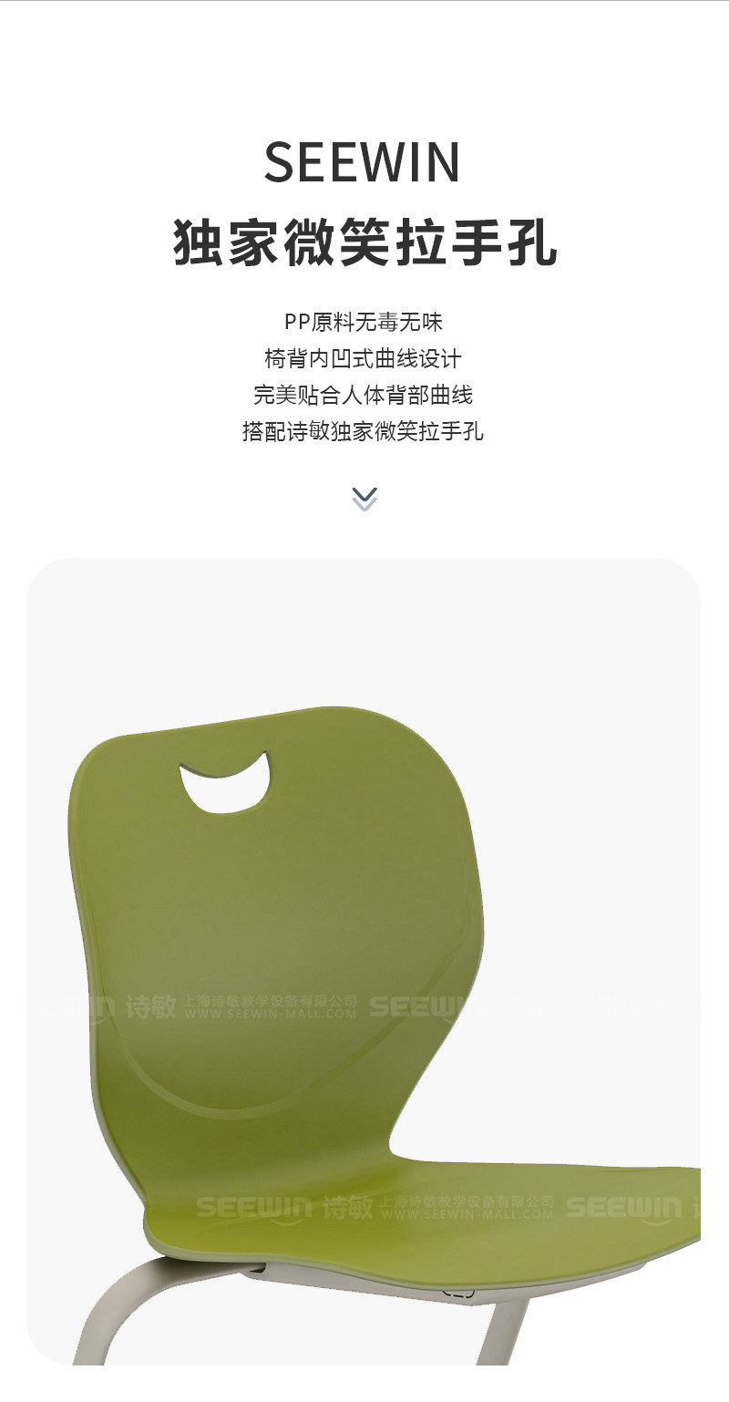SEEWIN詩敏學(xué)校家具格物系列學(xué)生課椅采用ABS注塑一次成型; 鋼管采用橢圓管滿焊焊接、表面采用高溫粉體烤漆,耐腐蝕、不易生銹。 4種椅腳可供選擇,適用于教室、培訓(xùn)室、圖書館等多種場合; 椅背和椅座的凹陷處理,更貼合人體曲線,幫助學(xué)生培養(yǎng)健康坐姿; 多種顏色可選,滿足您不同需求的搭配。