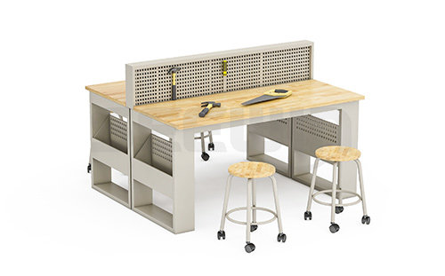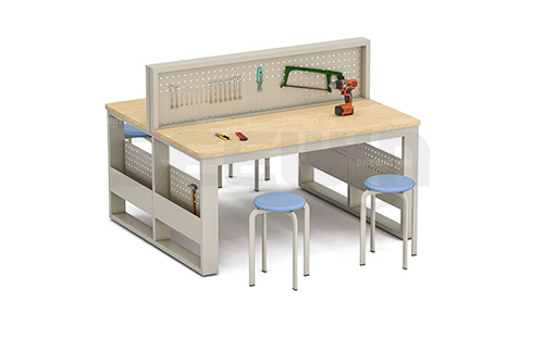 產(chǎn)品臺(tái)面采用橡膠木指接板,選材健康安全。桌面及兩側(cè)搭配洞洞板設(shè)計(jì),方便教學(xué)使用。適用于
