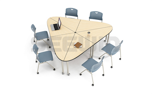 協(xié)作式三角形拼接造型,由三個右元素和三個左元素組成。這個形狀可以讓人們在角落里組成小型團隊,確保每個使用者能夠輕松愉悅地參與協(xié)作過程。桌面可選配翻轉(zhuǎn)式,用于放置電腦,筆記本電腦的電源和數(shù)據(jù)連接都可方便地連接使用。