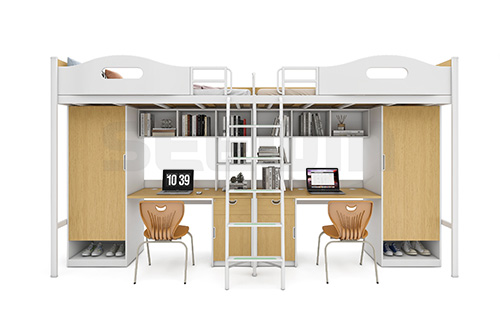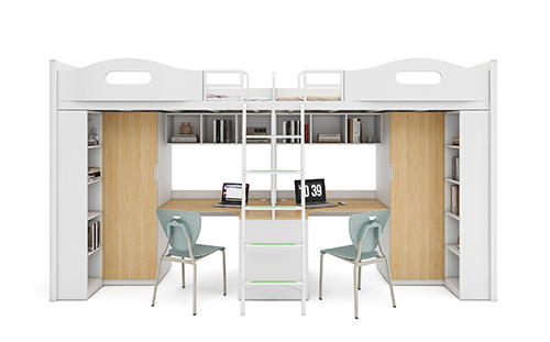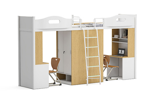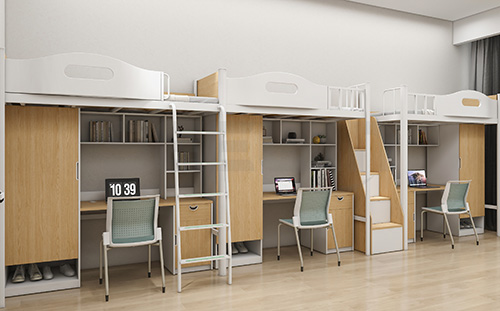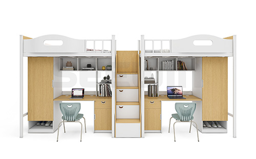 產(chǎn)品采用環(huán)保 E0 級 MFC 板材,健康安全,結(jié)構(gòu)堅固、經(jīng)久耐用。產(chǎn)品配置書柜、書桌,給學(xué)生提供獨立學(xué)習(xí)空間,衣柜、收納柜,可供學(xué)生日常生活使用。